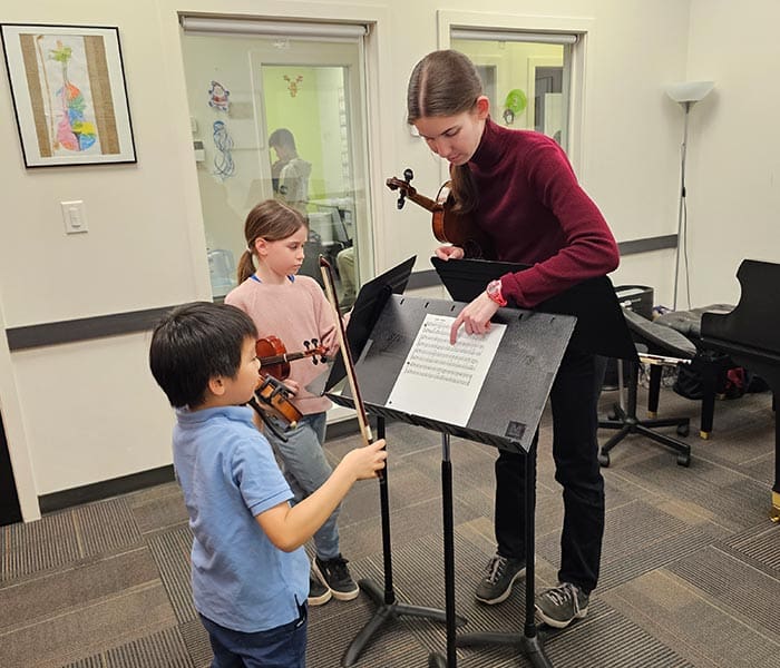 This class uses fun and challenging group activities to continue working on the skills learned in the private lesson, and to maintain Suzuki and additional repertoire learned through group games and polished group performance. Students will start the basics of note reading and 30-minute Music Theory class will further the note reading skills learned in the Violin Beginner class